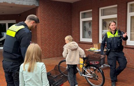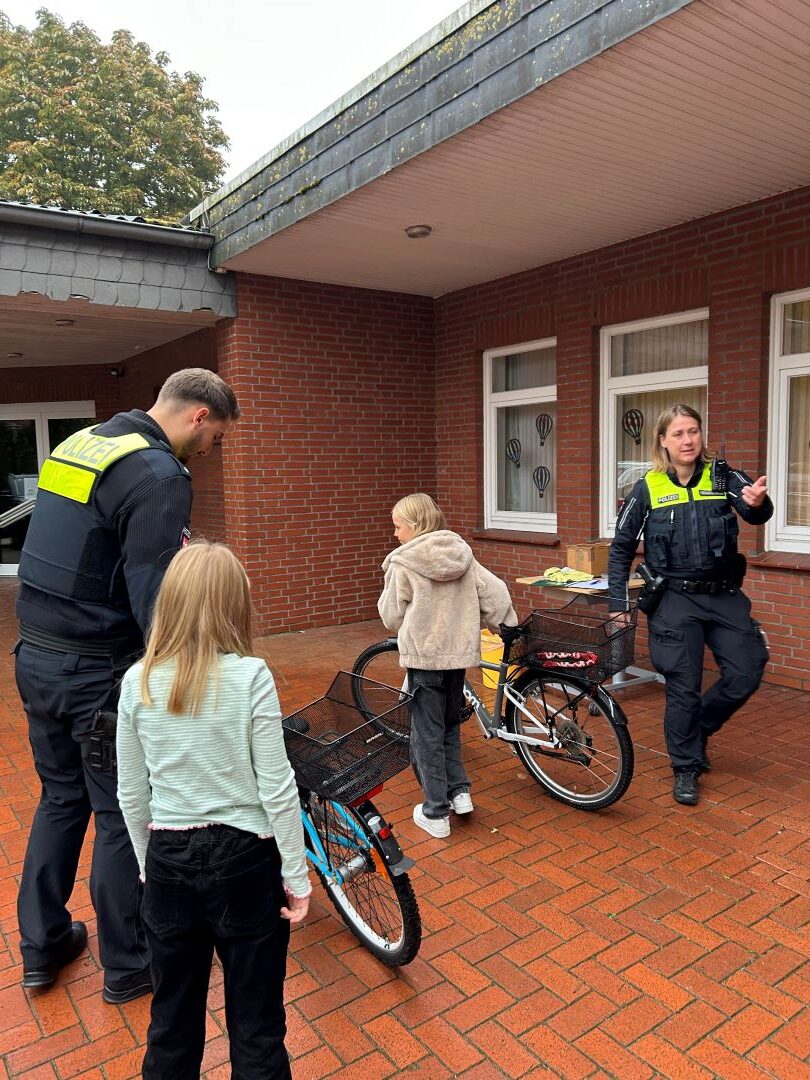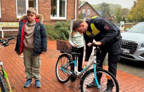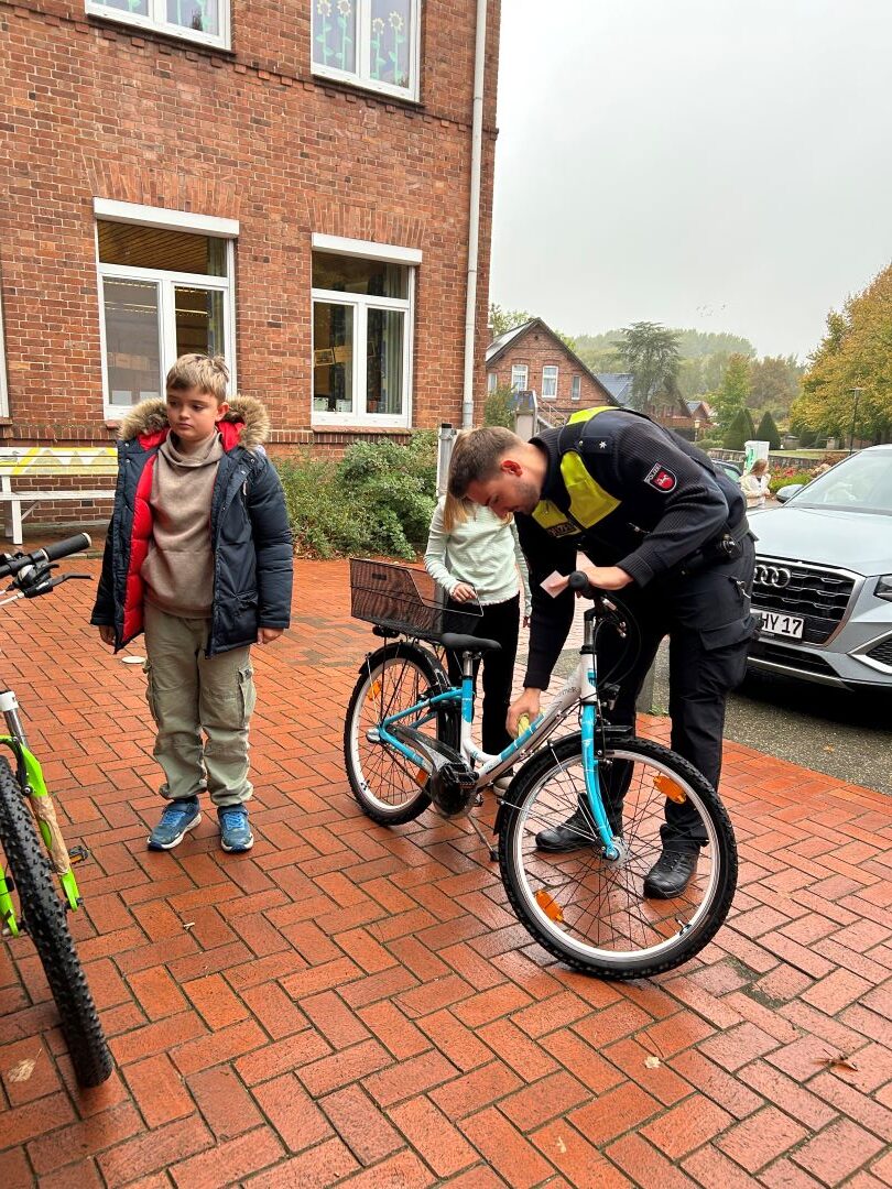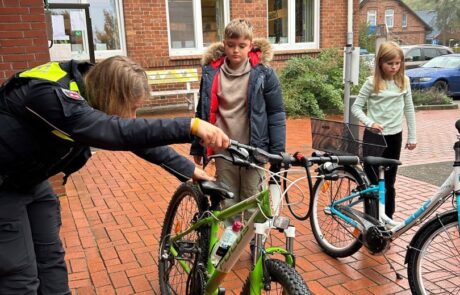 Heute hat die Polizei aus Emstek kontrolliert, ob die Fahrräder der Kinder verkehrssicher sind. Jedes Fahrrad wurde bis ins Detail durchgetestet. Die Kinder, deren Fahrräder in Ordnung waren, bekamen eine Fahrradplakette.